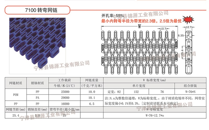 7100型轉(zhuǎn)彎網(wǎng)帶 開孔、平板、凸筋、滾珠、防滑形式,解決皮帶不跑偏,更換難等問題。